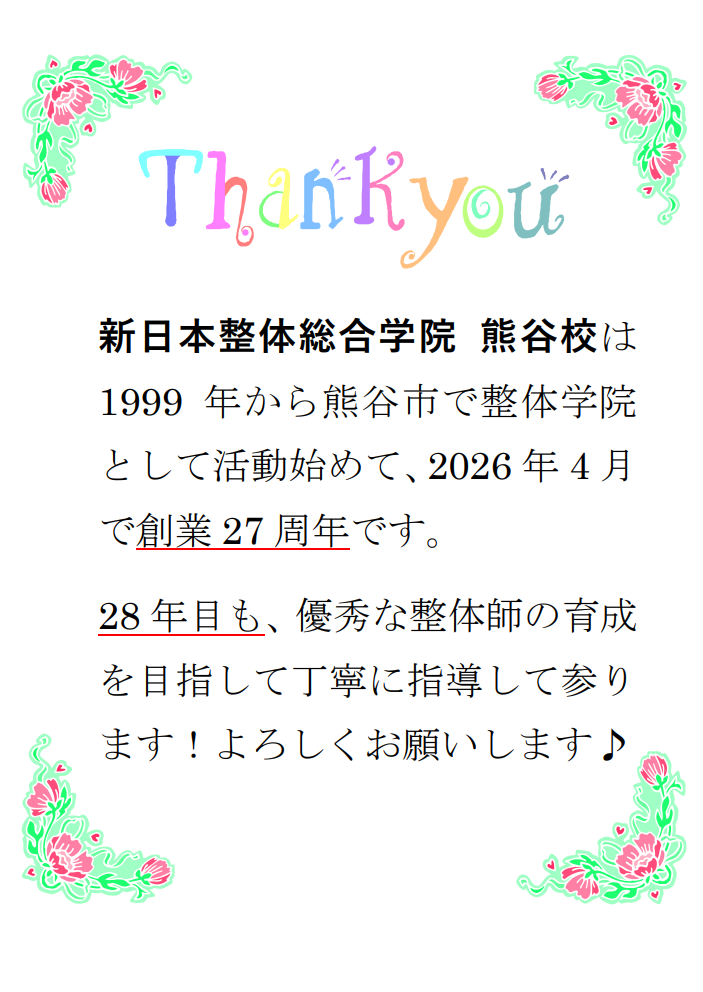 新日本整体総合学院 熊谷校は今年の4月で創立27周年になります!